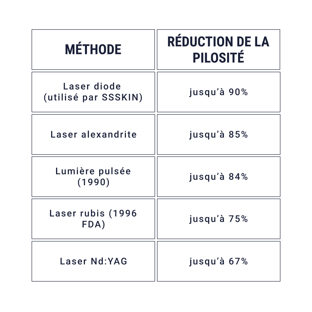 Bien que chaque technique ait ses avantages, l'épilation au laser Diode reste la technologie la plus efficace, rapide et sûre, adaptée à tous les phototypes et à tout type de poil, quelle que soit leur taille.